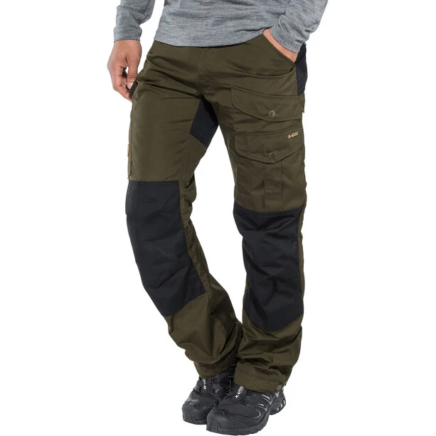 Durable trekking trousers for adventures in the mountains and forest. Made using durable wind and water-resistant G-1000 fabric with a double layer over the rear and knees. Regular waist (mid waist) and regular fit with pre-shaped knees. Six practical pockets including a map pocket and an axe pocket.